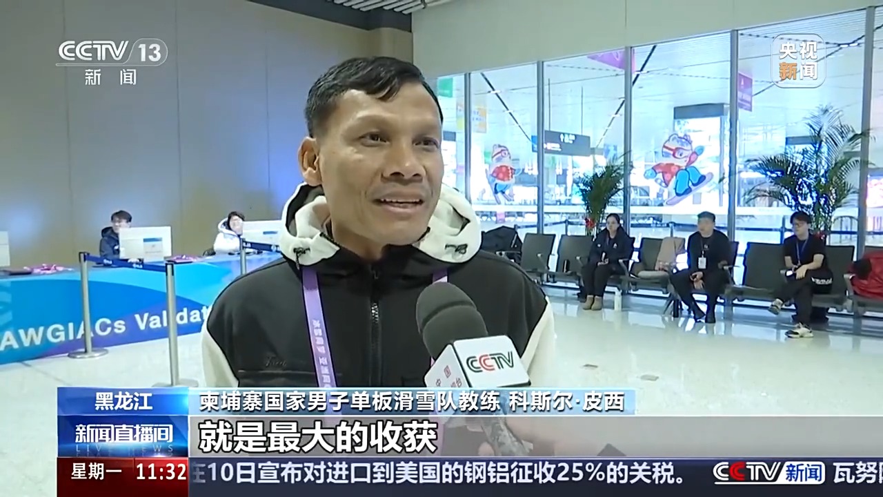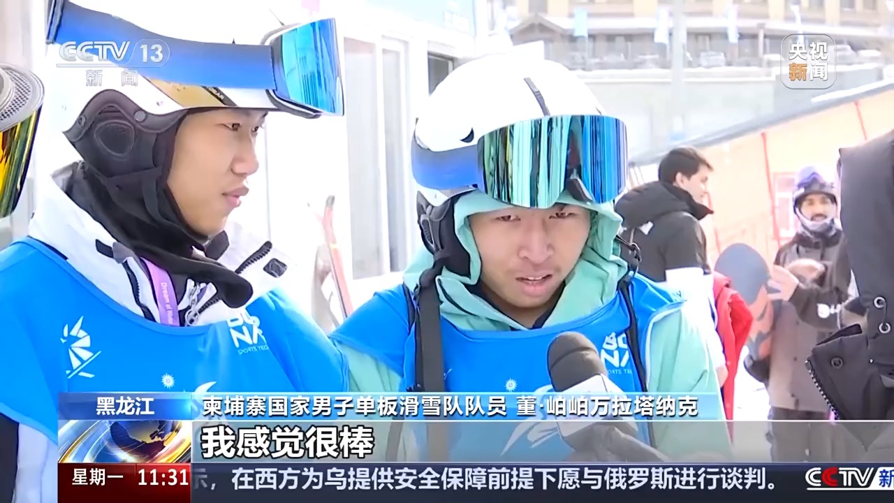 柬埔寨国家男子单板滑雪队教练 科斯尔·皮西:我们的运动员刚从韩国经历了大约两周的训练,这是他们第一次参加大型赛事。因为在柬埔寨我们没有雪,我们没有训练的基础设施,其实整个过程是很困难的,但我们勇敢地迈出了这一步,这次来到亚冬会,能参与其中,就是最大的收获。