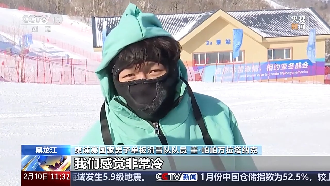 柬埔寨国家男子单板滑雪队队员 董·岶岶万拉塔纳克:适应比赛的环境确实不容易,今天零下20℃,我们感觉非常冷,手已经冻僵了。