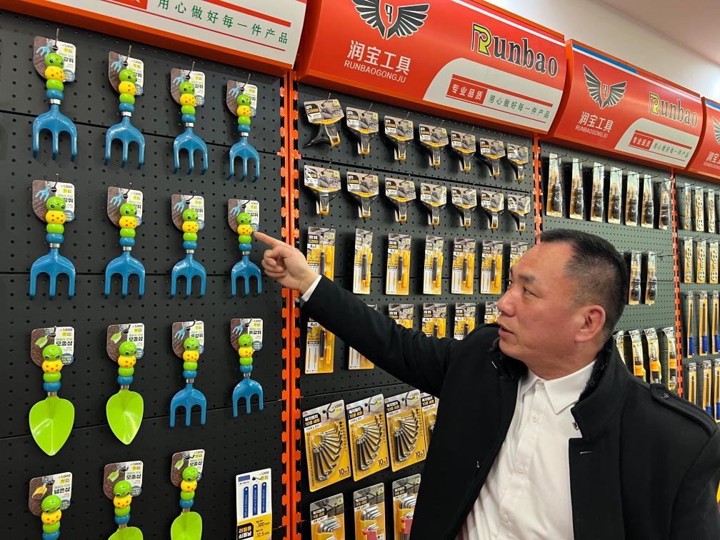 重庆市大足区润宝工具制造有限公司董事长侯亿林向记者介绍面向国际客户的五金产品。新华社记者 周文冲 摄