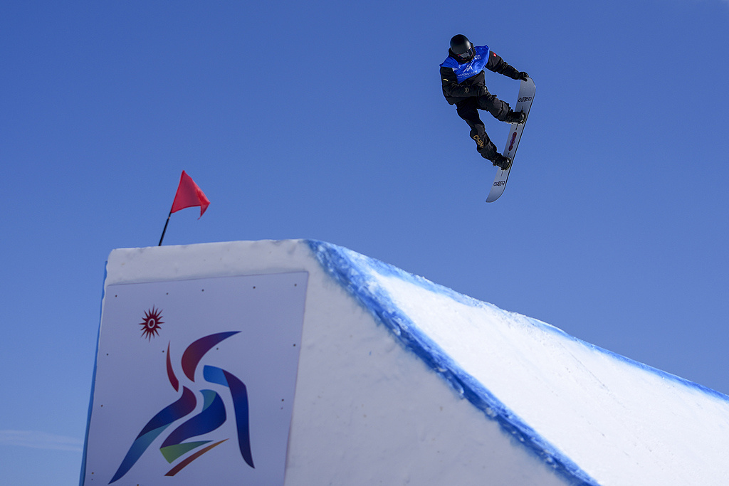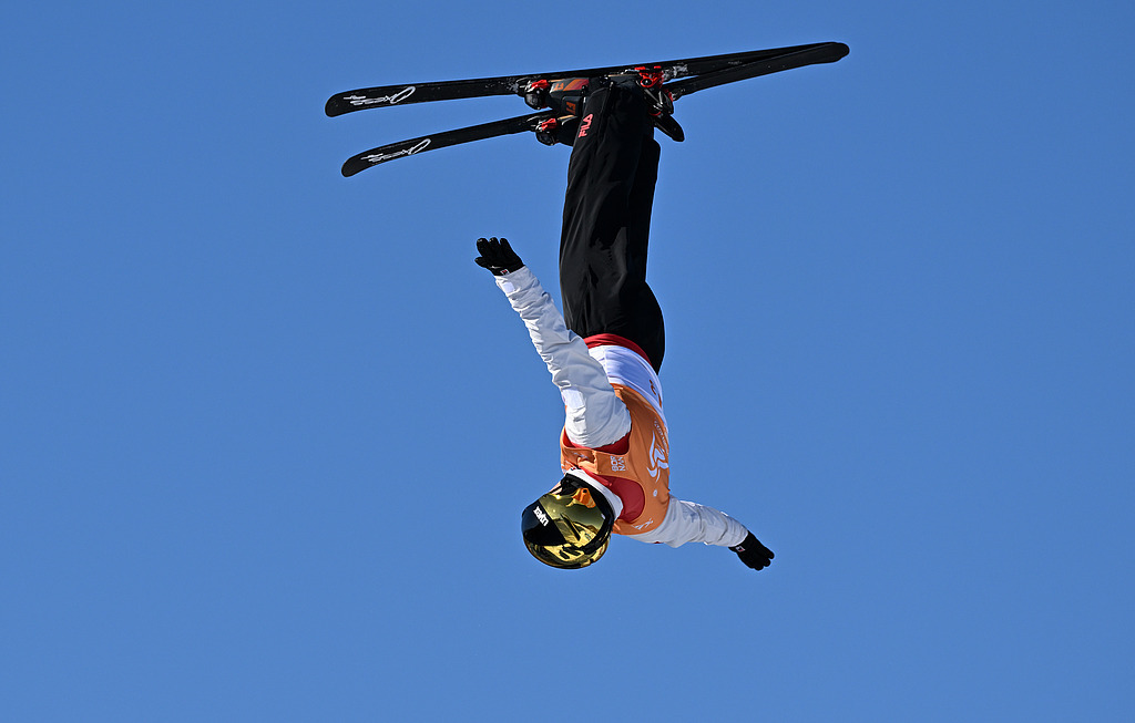 △2025年2月10日,中国队夺得哈尔滨亚冬会自由式滑雪空中技巧混合团体冠军。图为比赛中的齐广璞。