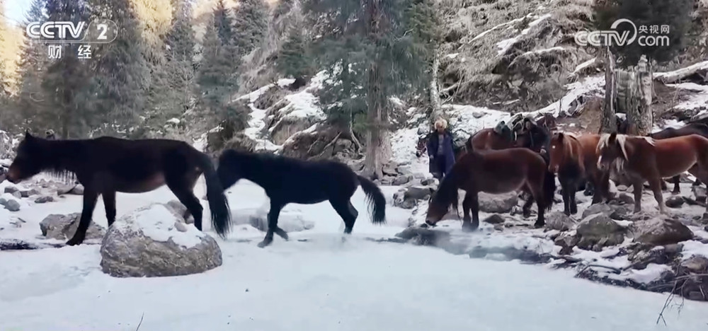 翻过达坂后,转场的队伍到了山下的松林,这里的积雪没有那么厚,但要穿过一条条冰河和结冰的山路才能继续向前。为了防止牲畜摔倒,大家要先把危险路段的冰清理掉,再撒上土防滑,才能让马和羊通过。即使这样,依然有一只羊的腿受了伤,简单包扎后才继续上路。