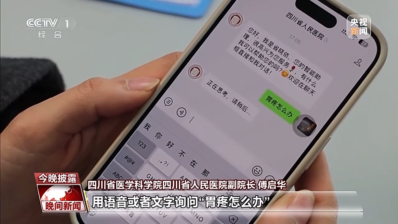 四川省医学科学院四川省人民医院副院长 傅启华:患者只需打开我们医院的微信公众号,用语音或者文字询问“胃疼怎么办”或“头疼应该挂哪个科室”,AI就能迅速给出贴心的建议和就医指南。
