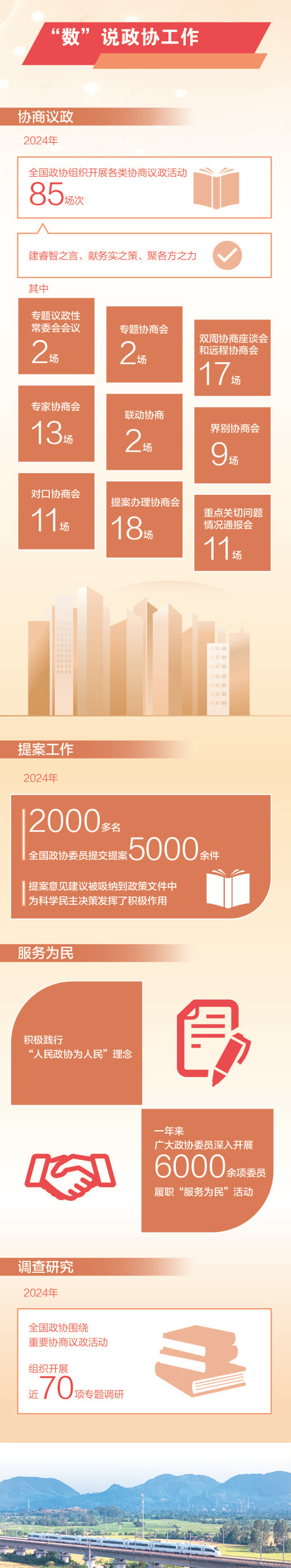 人工智能、绿色低碳、新质生产力、文化遗产保护、人口高质量发展、金融高质量发展……协商议题紧扣“国之大者”和民之关切;专题议政性常委会会议、专题协商会、双周协商座谈会、远程协商会、专家协商会、界别协商会、提案办理协商会……协商形式丰富多样,过去一年,全国政协组织开展各类协商议政活动85场次。一年来,全国政协把协商议政工作放到党和国家工作大局中精准定位、科学谋划,聚焦推进中国式现代化,建睿智之言、献务实之策、聚各方之力,协商议政质量和成效不断提升。