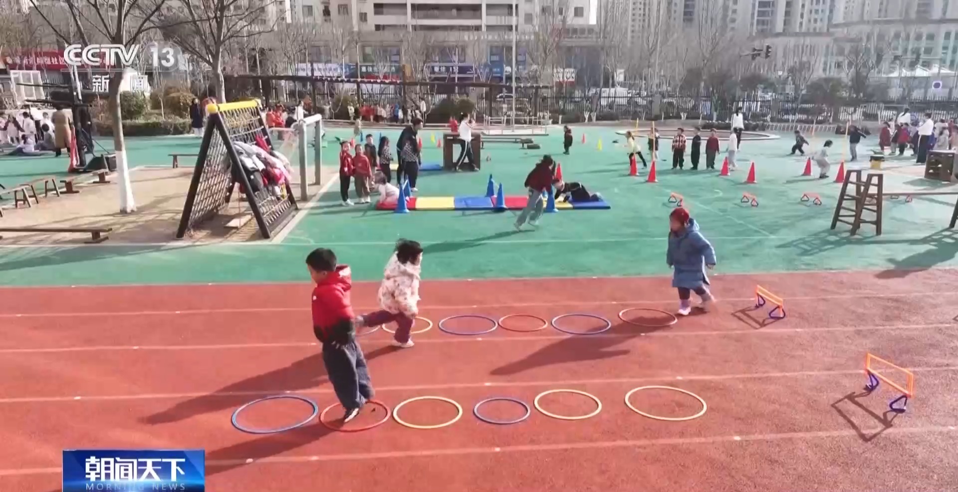 上午9时多,记者来到日照市的一家幼儿园时,孩子们正在做早操。这边都是3岁以上幼儿园小班到大班的孩子。而在另一片场地,一群2岁多的托班“小小孩”,正在老师的带领下做游戏。