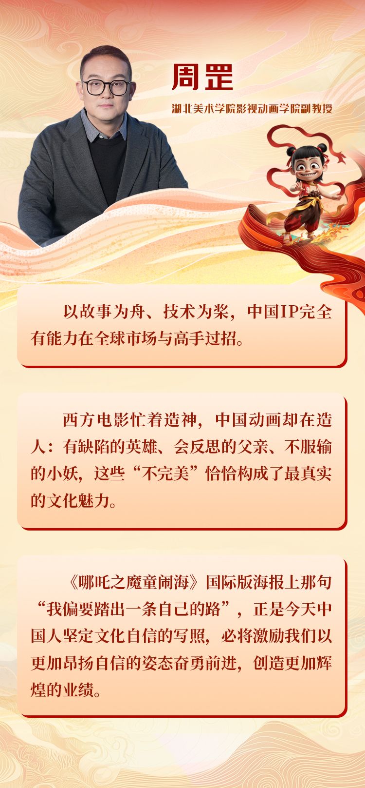 登顶全球电影单一市场票房榜、登顶全球动画电影票房榜……《哪吒2》自上映以来不断冲榜。在湖北省委网信办的指导下,荆楚网(湖北日报网)联合武汉大学马克思主义学院“马上见”团队,邀请武汉大学媒体发展研究中心副主任、新闻与传播学院教授肖珺,以及湖北美术学院影视动画学院副教授周罡,一起来聊聊这部创造神话的中国动漫电影。