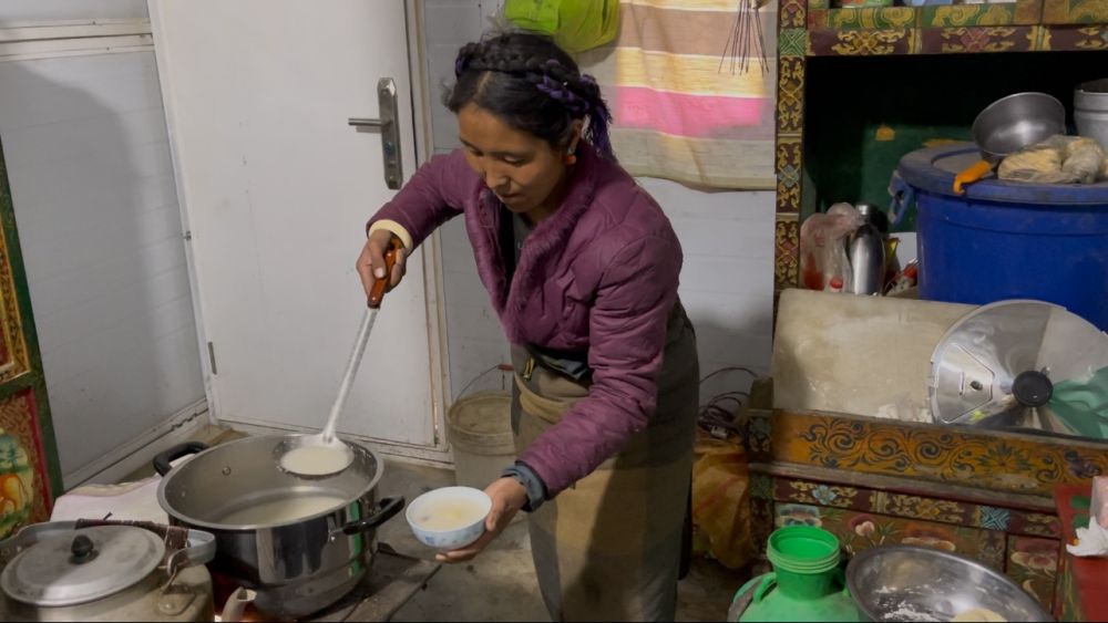 2月27日,阿旺次仁的妻子拉巴普尺正在盛“古突”。新华社记者 蒋梦辰 摄