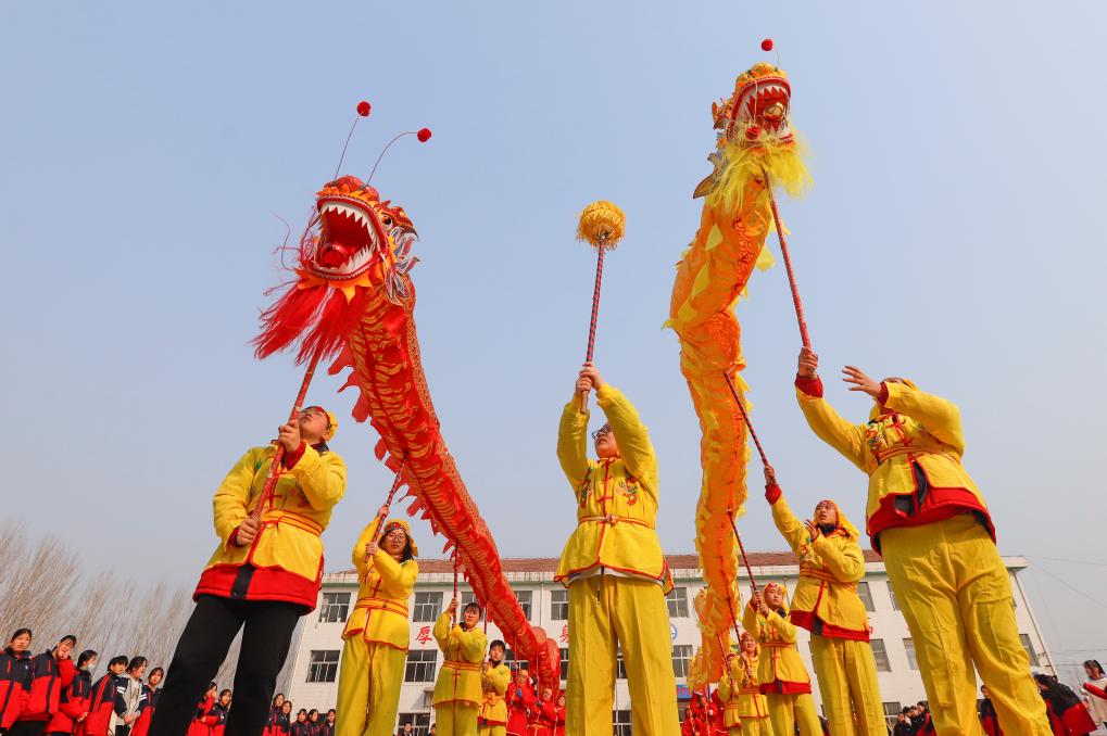 2月27日,河北省遵化市苏家洼镇下石河中学的学生在进行舞龙表演。 “二月二,龙抬头”来临之际,各地举办丰富多彩的活动,喜迎传统节日。新华社发(刘满仓摄)