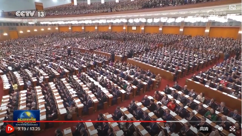 人民大会堂大礼堂气氛庄重热烈,主席台帷幕正中的国徽与会场穹顶上的五角星灯交相辉映。