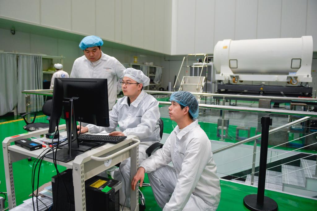 在长光卫星相机装调间,王升(右二)在调试卫星光学遥感载荷组件时与团队成员讨论细节。