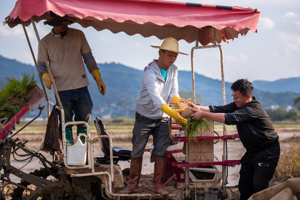 多年生稻科技小院的学生(右一)帮助当地农民一起插秧。