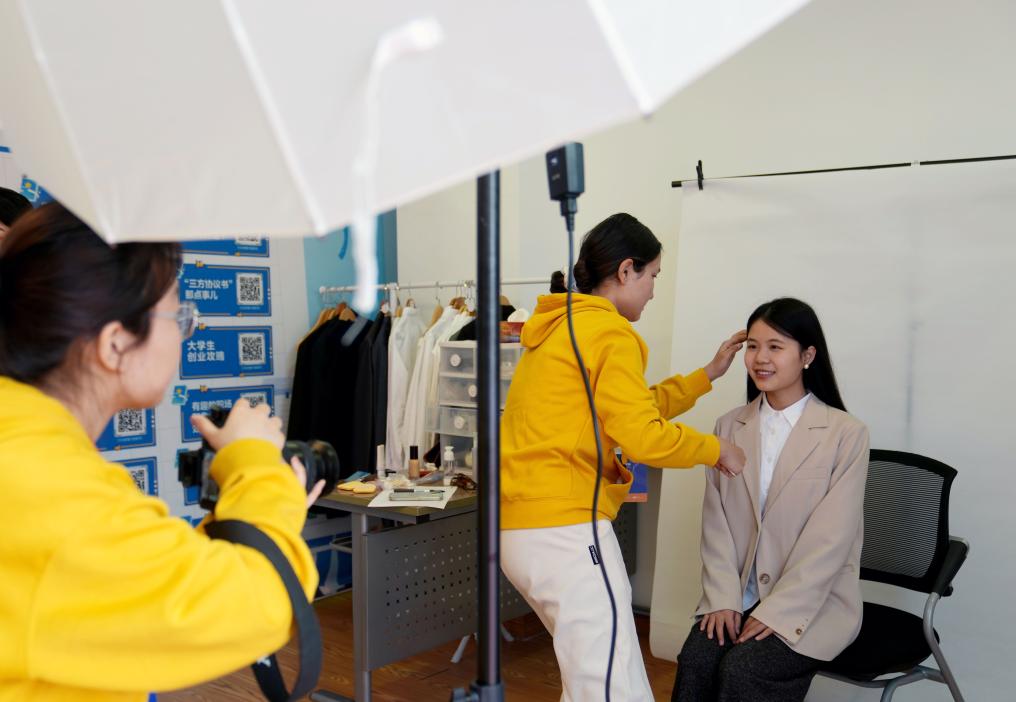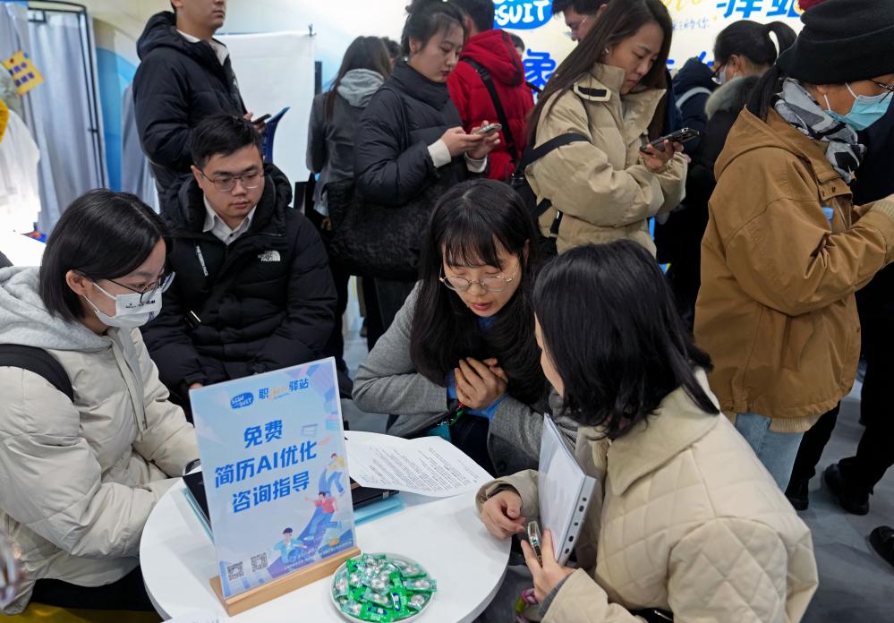 在上海一个大型招聘会现场,工作室团队为求职者进行简历优化指导。