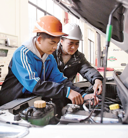 湖南省永州市江永县职业中专学校的老师在指导学生进行汽修实践操作。田如瑞摄/光明图片