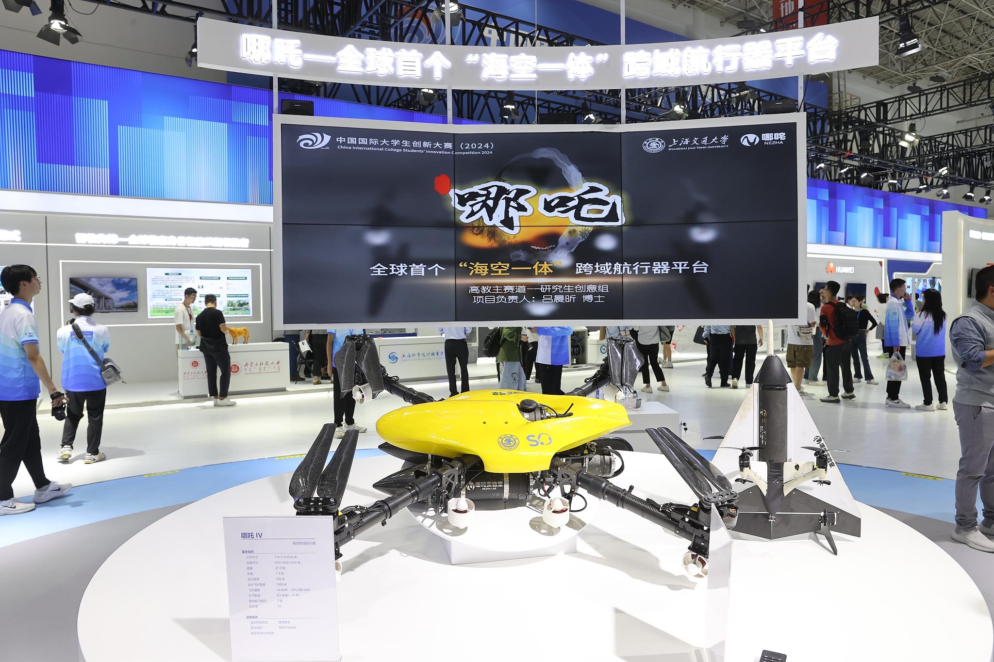 △2024年10月12日至15日,中国国际大学生创新大赛总决赛及同期活动在上海举行。来自上海交通大学的“哪吒——全球首个‘海空一体’跨域航行器平台”项目夺得冠军。
