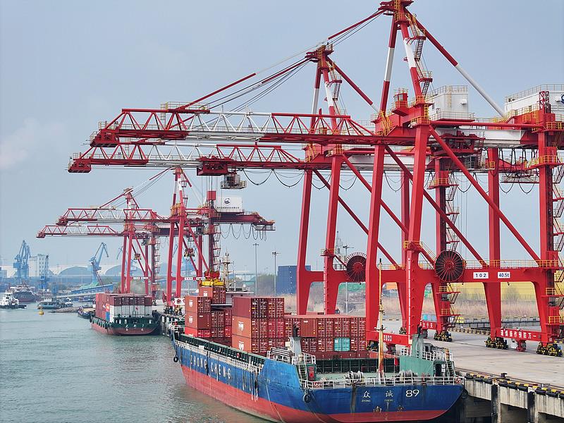 △江苏扬州港,货轮靠泊在港口装卸货物。
