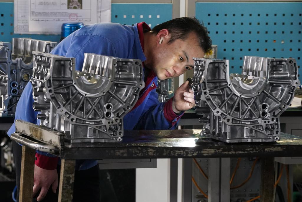 3月11日,工人在滁州悦达实业有限公司检查混动发动机缸体。新华社记者杜宇 摄
