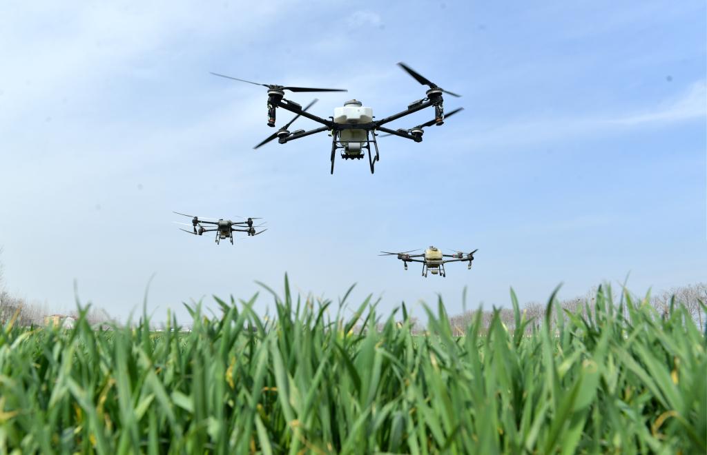 3月13日,在河南省夏邑县圣源果蔬种植专业合作社郭店镇杨吕庙村优质小麦种植基地,无人机在执行植保作业。新华社发(苗育才 摄)