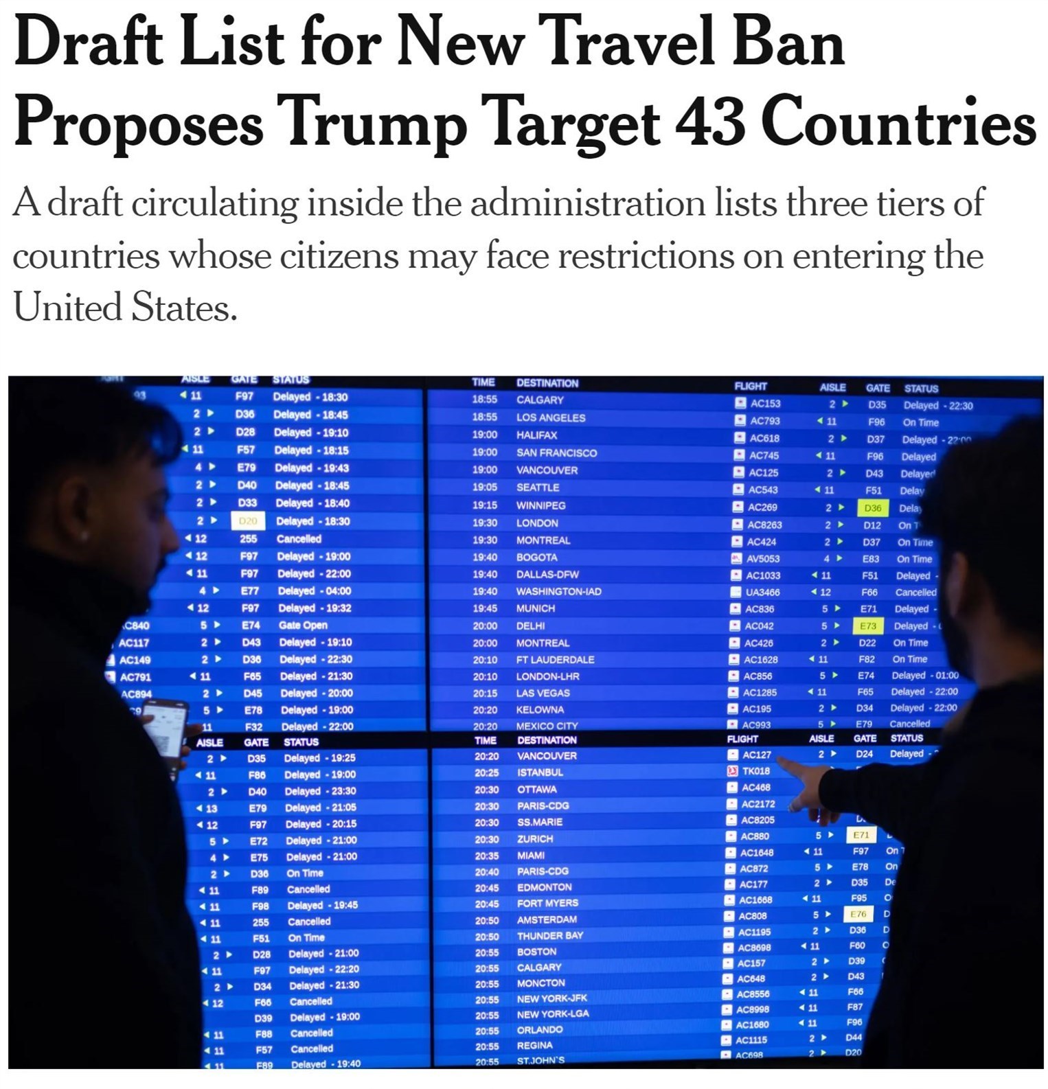 据美媒报道,特朗普政府正在考虑对几十个国家的公民实施旅行签证限制。