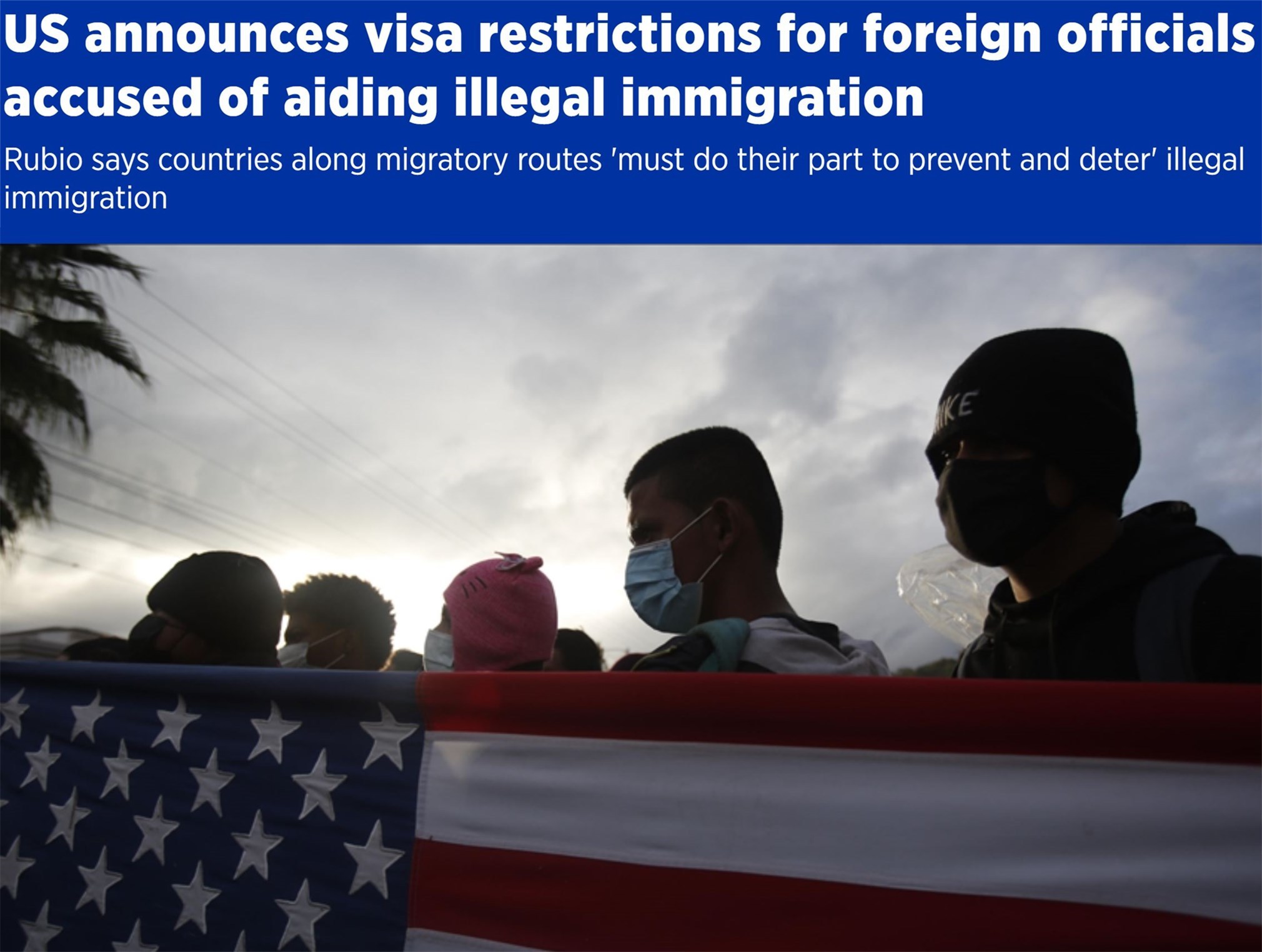 美国国务卿鲁比奥本月初发表声明,宣布针对外国官员及其他“协助非法移民进入美国”的人员实施签证限制。