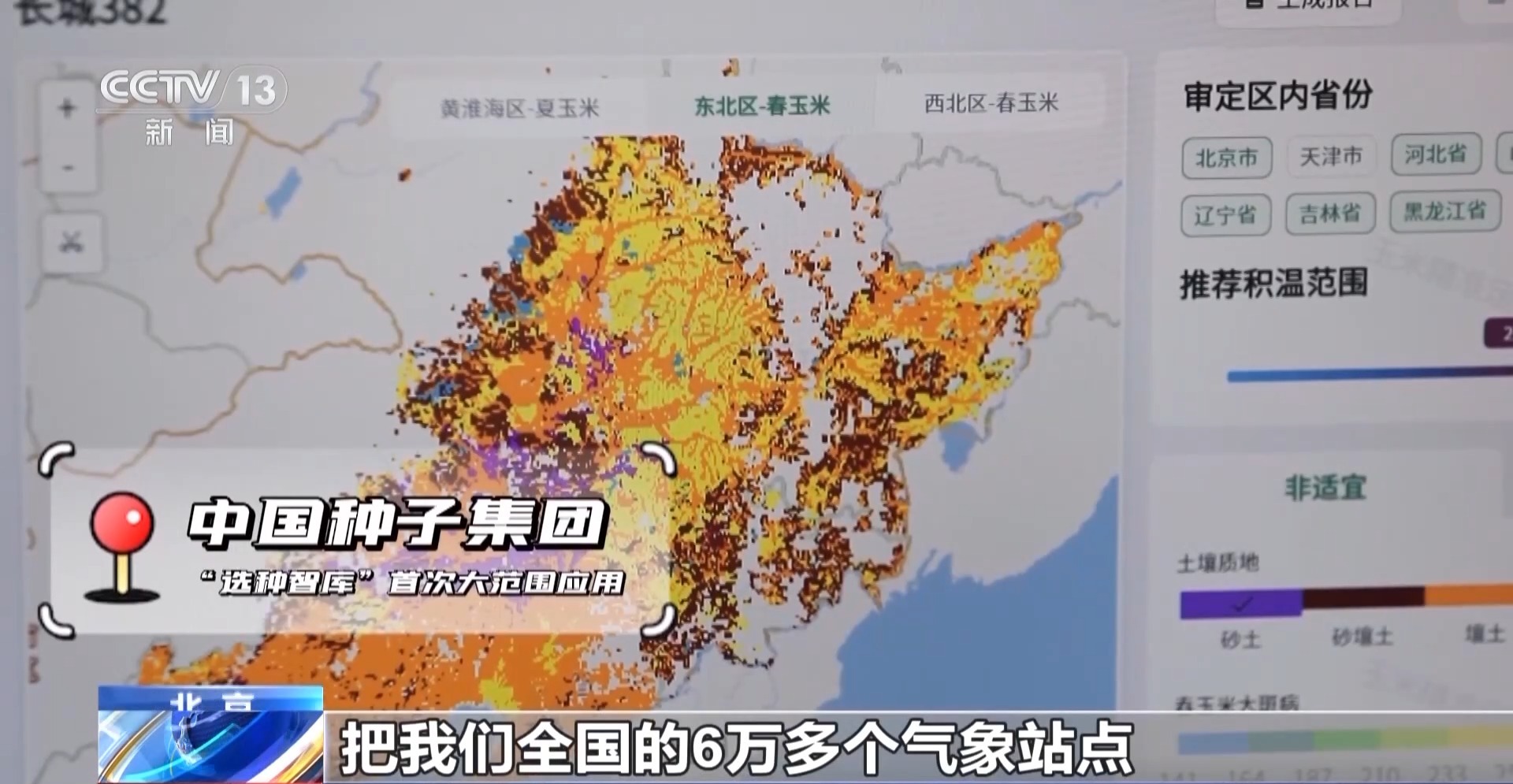 中国种子集团科技创新部负责人 宋维波:把全国的6万多个气象站点以及土壤的一些信息,通过新的一些算法模型来精准预测到每一个品种最适宜的生长区域,精准度能到5×5公里,为每一个玉米品种精准绘制“适生地图”,今年春耕我们向东北、黄淮海累计投放10个新品种。