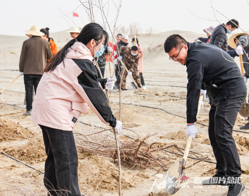 3月15日,在拜城县亚吐尔乡布吉尕村植树现场,该村干部群众精神抖擞,分工协作、默契配合,有的挥锹铲土,有的扶苗填坑,每道工序都认真细致,现场一派热火朝天的景象。