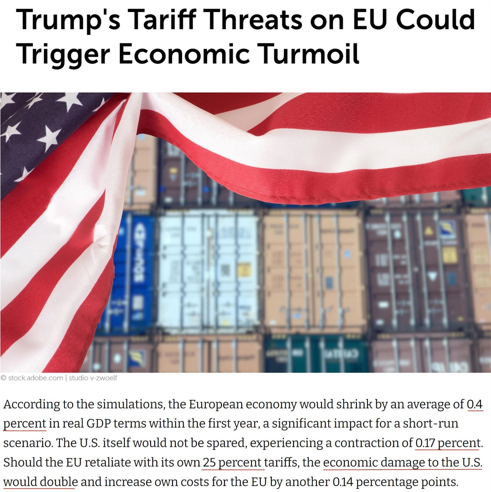 据德国基尔世界经济研究所此前推算,如果美国计划中的关税措施全部落地,欧盟和美国经济在第一年将分别萎缩0.4%和0.17%。如果欧盟以25%的关税加以反制,美国的经济损失将翻倍。