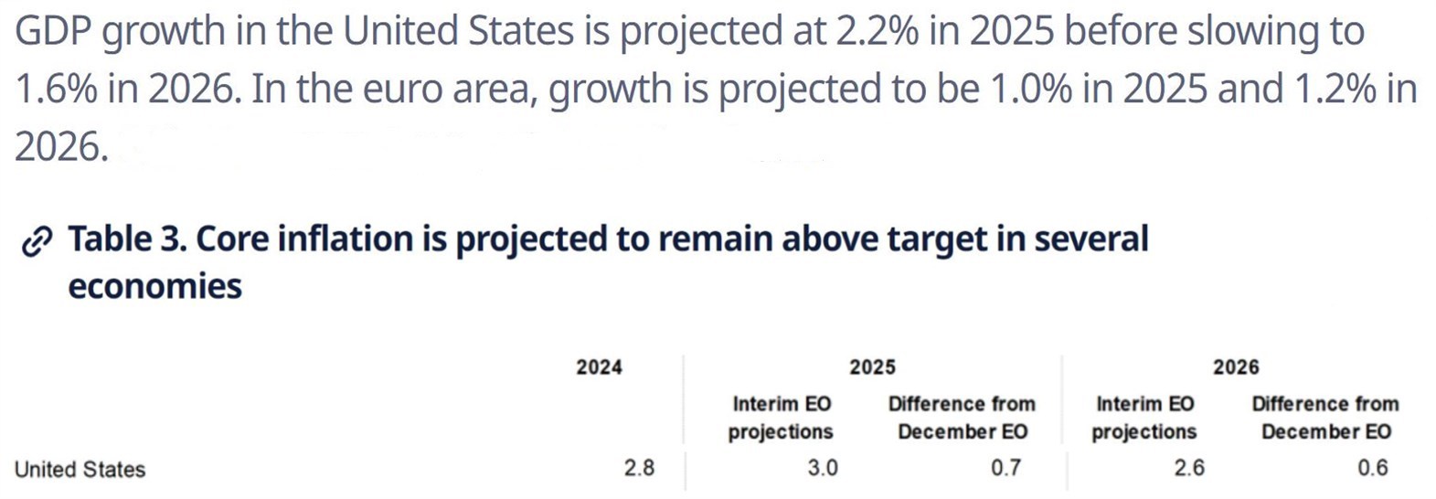 报告预计,受贸易壁垒增加等因素影响,欧元区经济2025年和2026年的增长率将均较此前预测下调0.3个百分点;美国经济2025年和2026年的增长率也将分别较此前预测下调0.2和0.5个百分点。