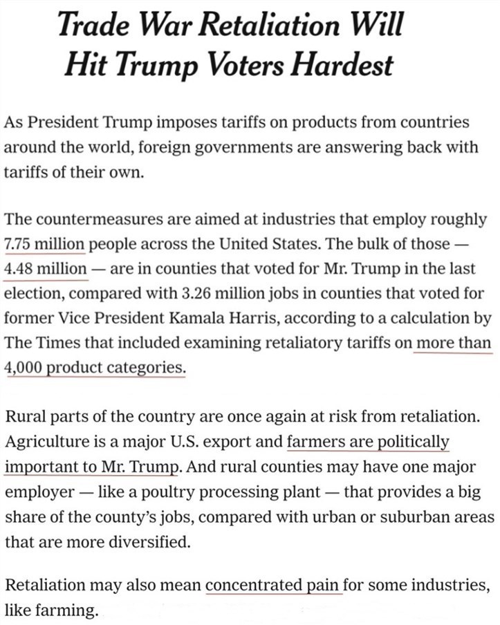 《纽约时报》对美国遭受反制关税打击的4000多个产品类别进行的分析显示,各行业共有约775万人受到波及,其中约有448万人来自大选中支持特朗普的地区,主要集中在以农业为主要产业的美国中西部、南部和东南部。