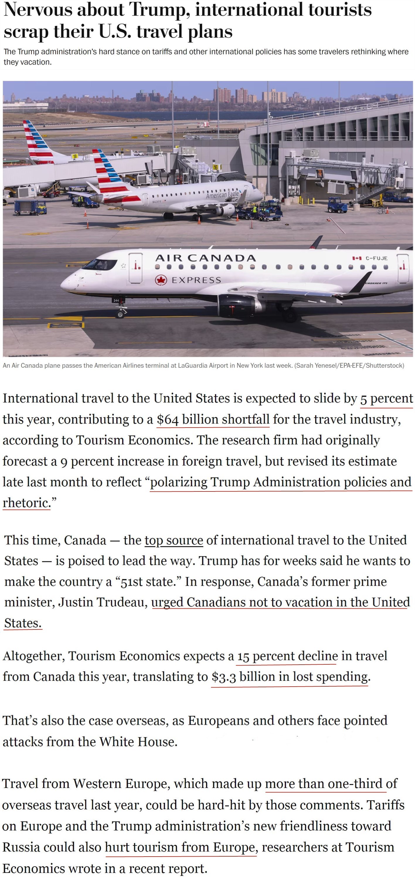 与此同时,西欧的赴美旅游也可能受到沉重打击。去年,西欧游客占到美国海外游客的三分之一以上。而美国旅游经济咨询公司最近的一份报告显示,对欧洲加征关税等做法可能会让欧洲人转投其他旅游目的地。