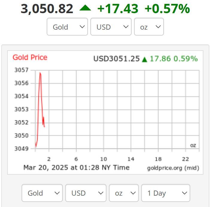△当地时间20日开盘后,纽约商品交易所现货黄金价格一度接近每盎司3057美元(图自国际金价网站)