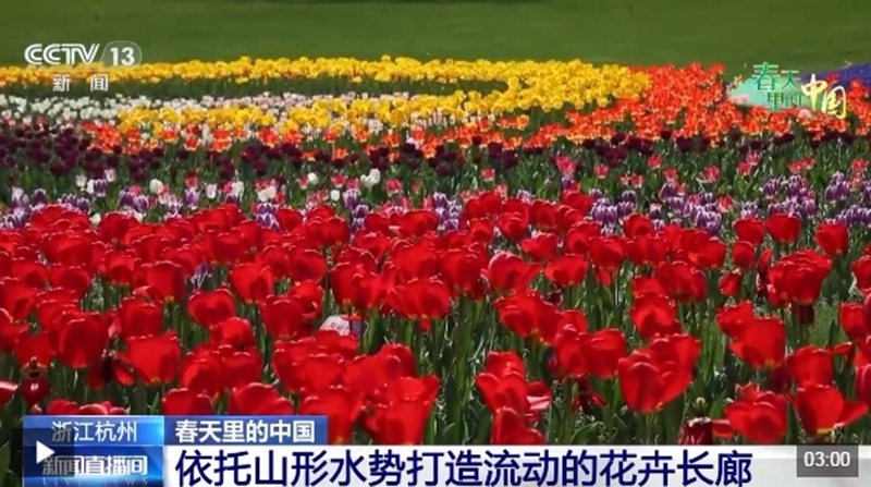 春光明媚春风柔,春花烂漫春意浓。眼下,在浙江杭州的太子湾公园里,数十万株郁金香竞相绽放,五彩斑斓的花海与周围的青山绿水相映成趣,构成一幅绝美的春日画卷。