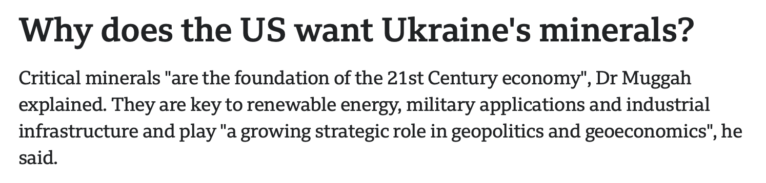乌克兰的矿产资源丰富,包括钛矿、锂矿,以及有色金属和稀土等。英国广播公司网站刊文说,关键矿产是“21世纪经济的基础,在地缘政治中有着重要战略意义”。同乌克兰的矿产协议是美国争夺未来产业主导权的战略布局。