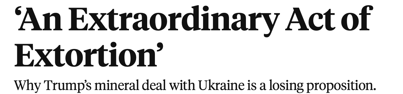 美国哥伦比亚大学欧洲研究所所长亚当·图泽将该矿产协议形容为“一次非同寻常的勒索行为”。