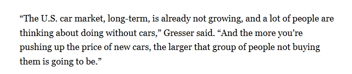 “从长期来看,美国汽车市场已不再增长,越是推高新车价格,不买车的人就会越多。”