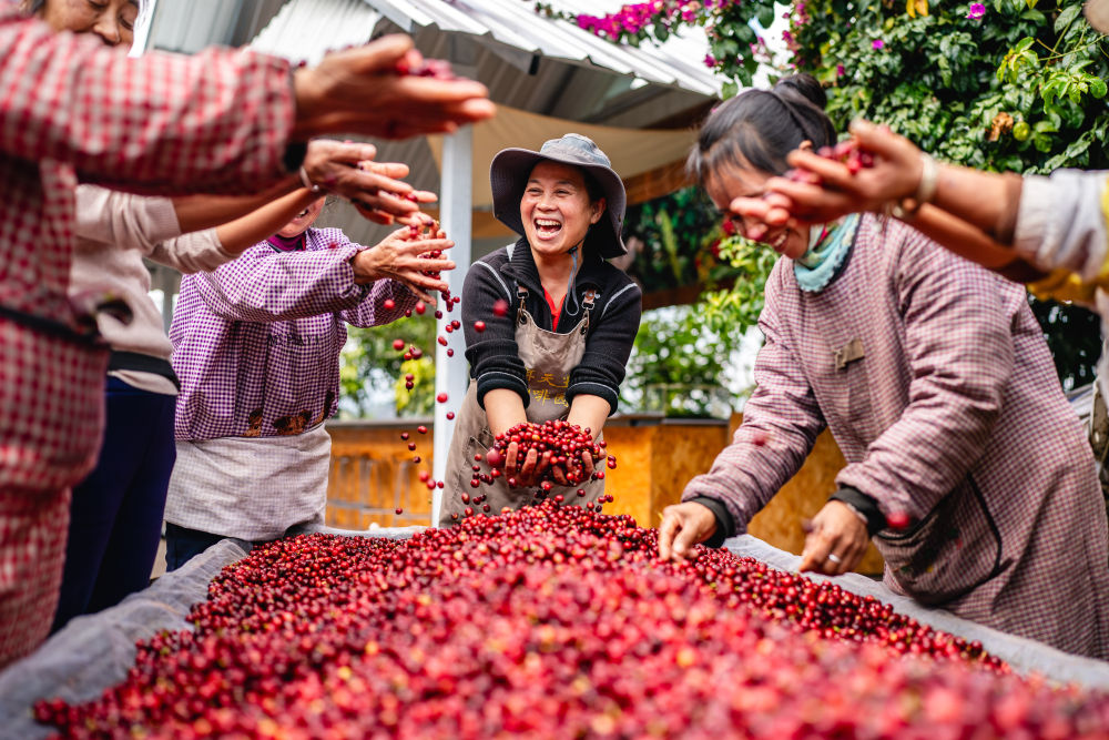 在云南省普洱市思茅区天玉咖啡庄园,人们在庆祝今年咖啡丰收(2025年1月8日摄)。新华社记者 胡超 摄