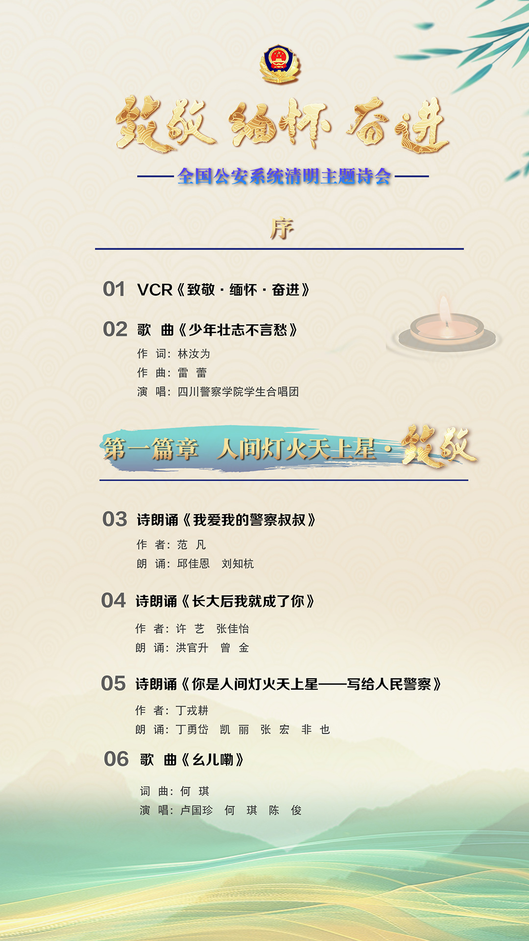 中国网4月2日讯(记者 王瑞芳)为充分展现全国公安机关和广大公安民警、辅警时刻铭记习近平总书记的关心关怀,时刻为党和人民而战的忠诚政治本色,深情追忆一年来公安系统涌现的英雄模范感人事迹,激励引导广大公安民警以更加奋发有为的精神面貌,坚决履行好党和人民赋予的神圣职责使命,今年清明节当天,公安部新闻宣传局、全国公安文联、四川省公安厅联合举办“致敬·缅怀·奋进”2025年全国公安系统清明主题诗会。