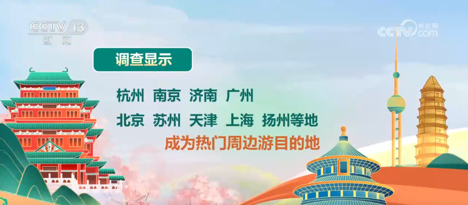 调查显示,90%的游客出游半径在500公里以内,44%的游客会选择自驾出游,杭州、南京、济南、广州、北京、苏州、天津、上海、扬州等地成为热门的周边游目的地。