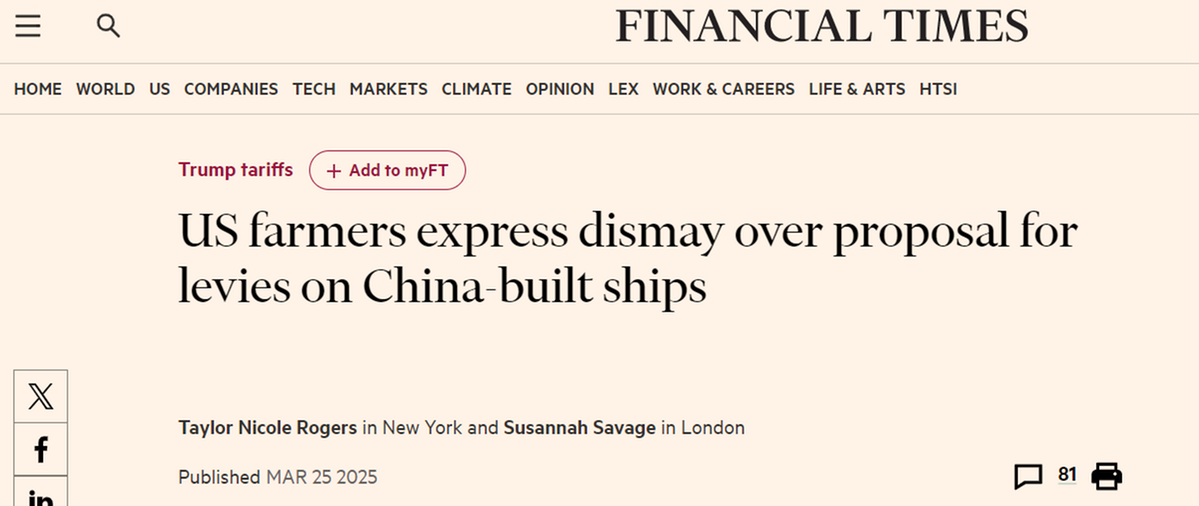 另据英国《金融时报》报道,美国中西部农民非常担忧,加征“港口费”必将进一步削弱农产品出口竞争力。美国大豆出口委员会首席执行官吉姆·萨特表示,整个行业对提案“措手不及”。
