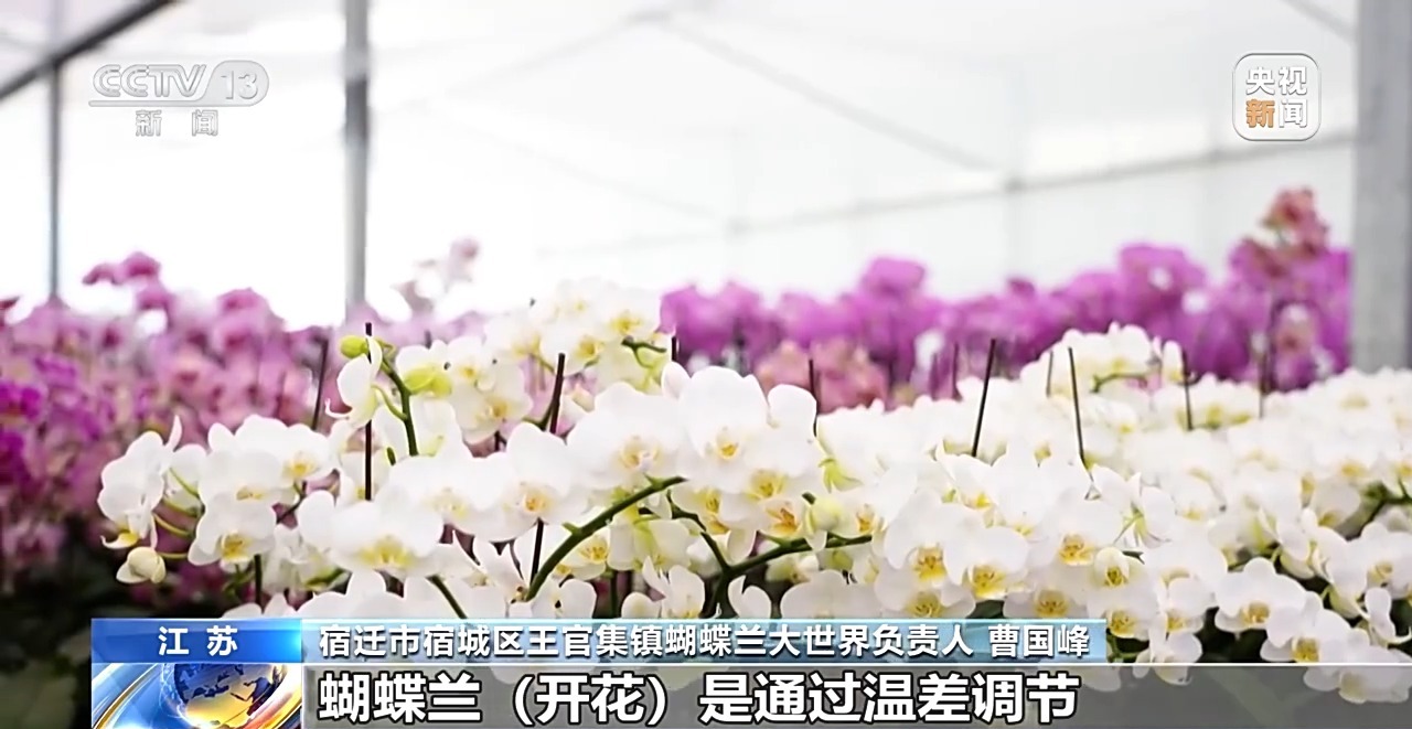 宿迁市宿城区王官集镇蝴蝶兰大世界负责人 曹国峰:其实蝴蝶兰的自然花期应该是农历年开始一直到“五一”,这是自然状态。现在我们通过技术干预,想哪一天开就哪一天开。蝴蝶兰开花是通过温差调节,这个时候我们就要用空调,一些恒温设备以及除湿设备进行恒温控制。