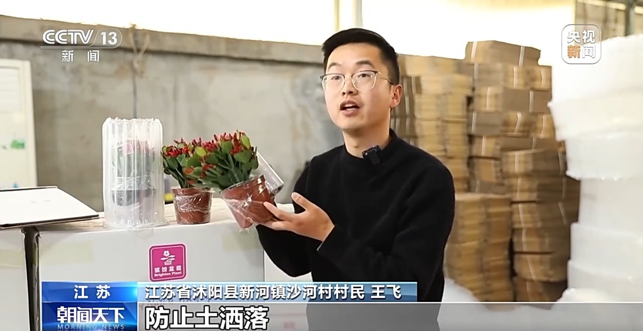 江苏省沭阳县新河镇沙河村村民 王飞:我们先用保鲜膜锁住盆里面的水分,防止土洒落,这样的包装可以让花到买家手里时更新鲜一点。然后会用到防摔的气柱,能保护花朵。