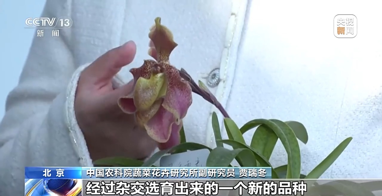 中国农科院蔬菜花卉研究所副研究员 贾瑞冬:我们所做的工作就是怎么把物种繁殖利用起来。比如同色兜兰和带叶兜兰经过杂交选育出来的一个新的品种“灵秀霞光”,它的花兼具了同色兜兰和带叶兜兰的优点,开不止一朵花,花瓣还比较厚,花比较大,花期会比较长。