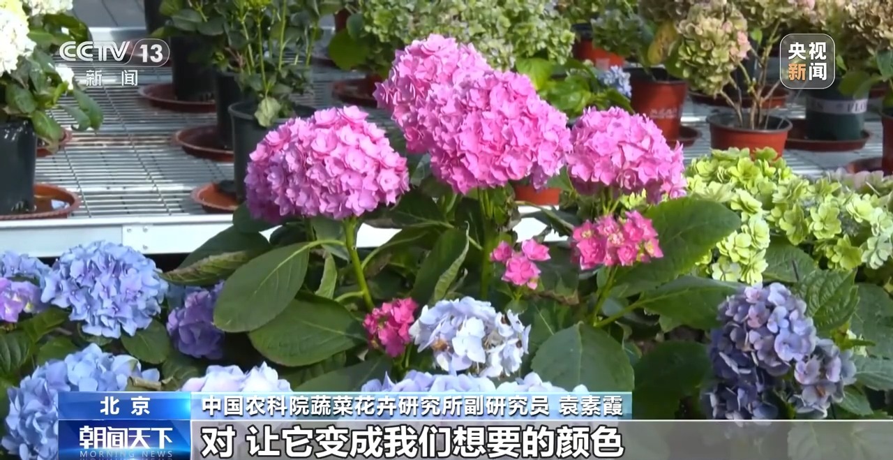 中国农科院蔬菜花卉研究所副研究员 袁素霞:让它往蓝变的过程中,变成其他的颜色,比如蓝紫色、紫罗兰色都是可以的。因为我们在土壤中加入了一个关键的重要物质铝离子,可以精准调控,可以让花变成我们想要的颜色。