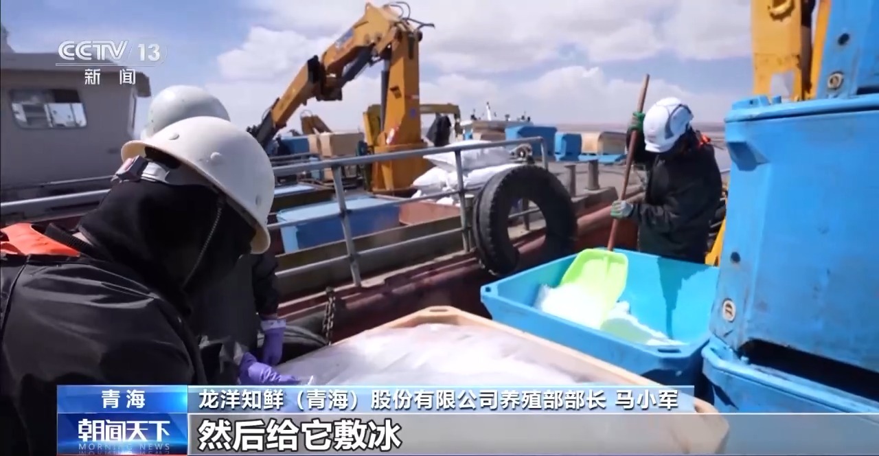 龙洋知鲜(青海)股份有限公司养殖部部长 马小军:我们用保温箱,然后给它敷冰,降温以后立马就拉到码头,送到加工厂。