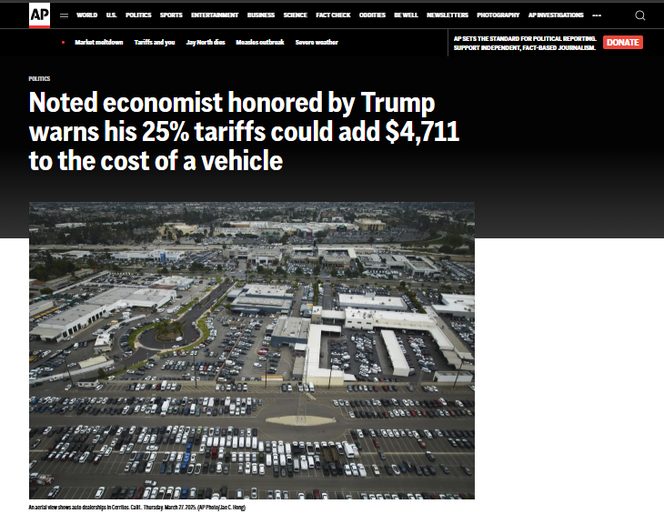 再来看具体行业。美国对进口汽车加征25%关税的政策已经正式生效。