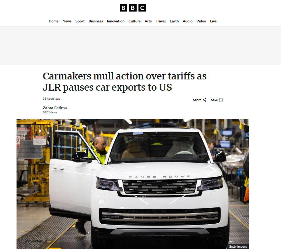 来看两个汽车产业界已经发生的对美国关税政策的回应。第一条消息来自英国汽车制造商捷豹路虎,关键词是“暂停对美出口”和在美国“涨价”。