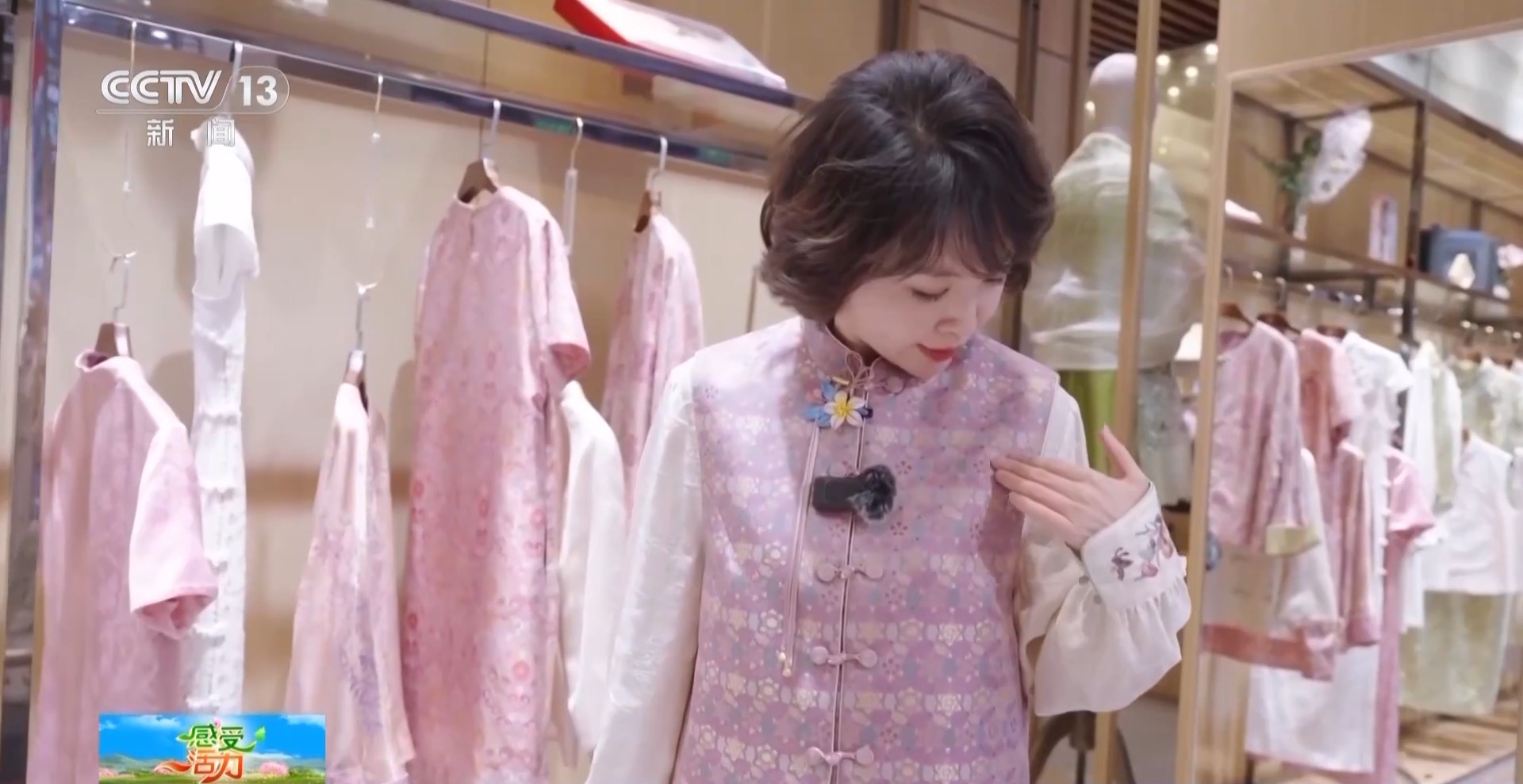 看!妙然把春天穿在了身上,这五个淡粉色的花瓣就是海棠,海棠配海棠是不是特别好看?这件衣服,出自天津老美华服装开发部设计师李虎之手。
