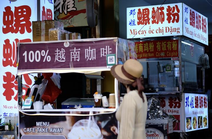 这是在中国东兴口岸拍摄的街景。中越两国游客在这里品尝特色美食、咖啡。新华社记者 郑开君 摄