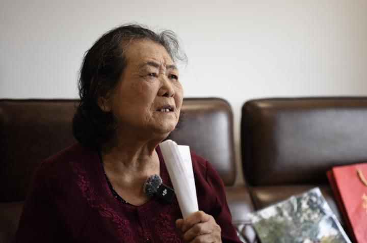 采访中,陈明月老人把纸卷成“麦克风”向记者演唱《康定情歌》。新华社记者 宿亮 摄