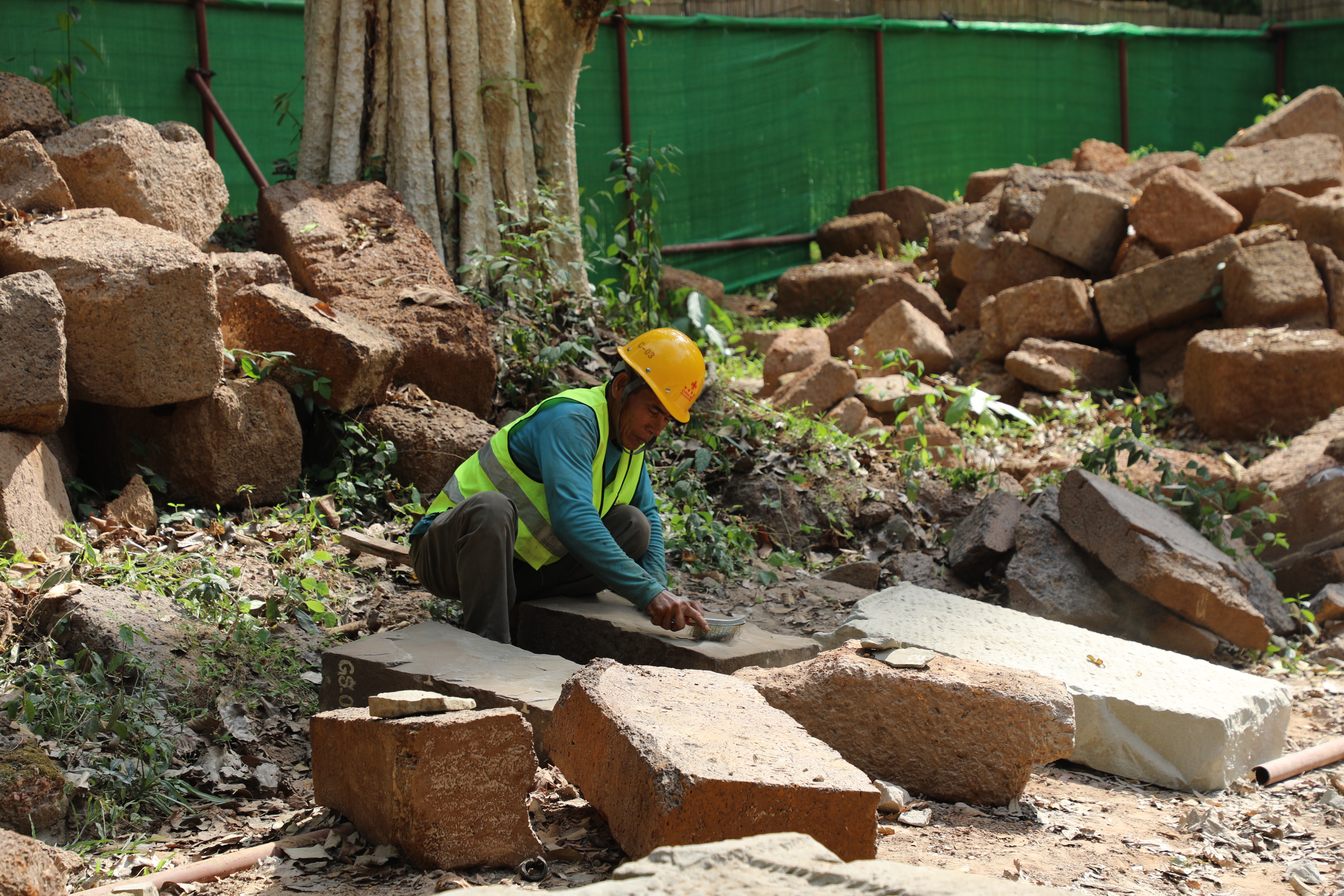 一名柬埔寨工人正在王宫遗址修复现场工作。(人民日报记者曹师韵 摄)