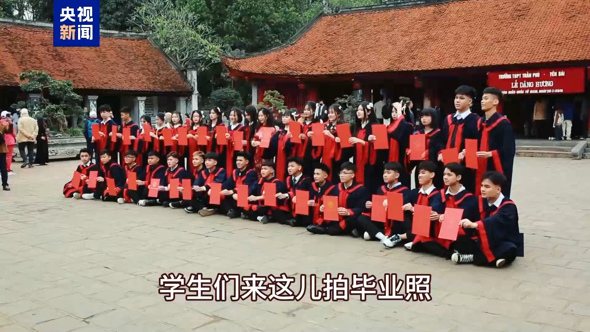 越南女学生:因为这里是一个神圣的地方,学生们来这儿拍毕业照,大家来文庙祭拜,希望能取得更好的学习成绩。