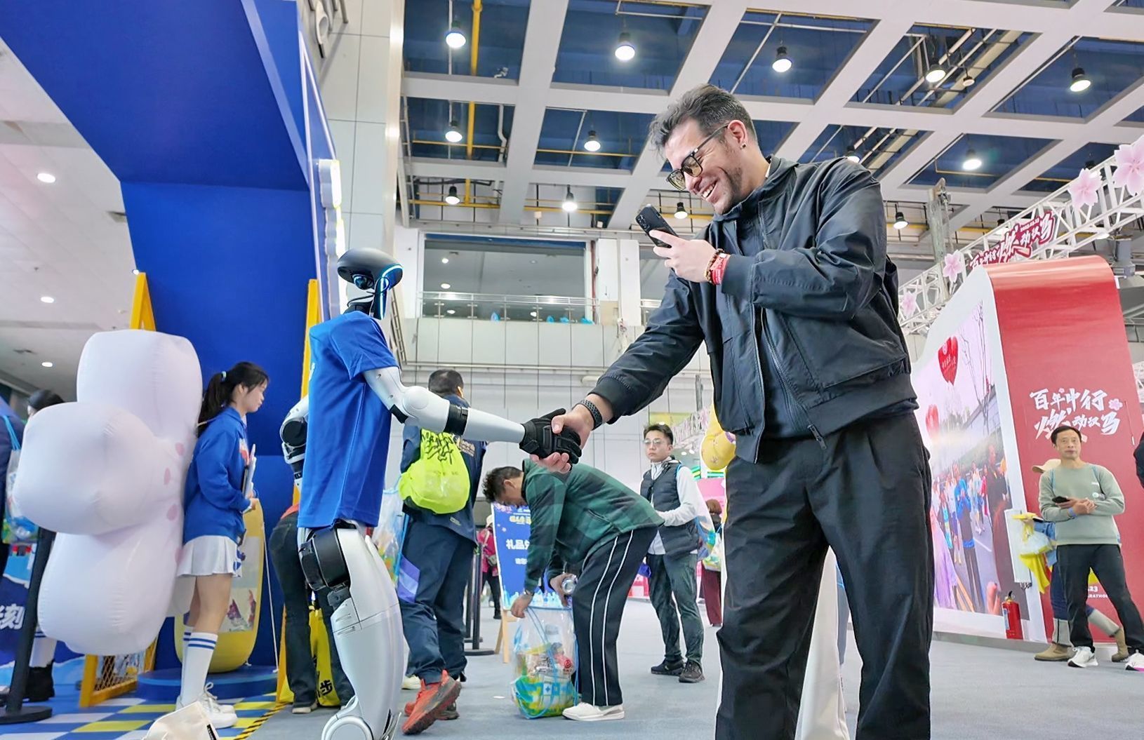 3月20日,在武汉国际会展中心,2025武汉马拉松迎来了首个参赛选手报到领物日。委内瑞拉选手吴瑞龙看见人形机器人志愿者,开心地上前与它握手。